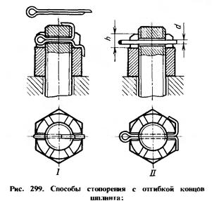 В современных конструкциях (рис. 299) для увеличения хода затяжки (пределов шплинтуемости) в верхней части гайки делают пазы (обычно шесть — по числу граней гайки) глубиной h, существенно большей диаметра d шплинта. Шплинт, выполненный из проволоки полукруглого сечения, вводят в один из пазов гайки и в поперечное отверстие в верхней, ненагруженной, части болта; концы шплинта огибают.