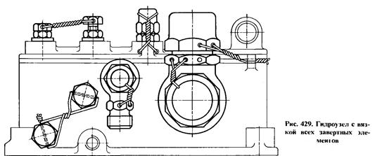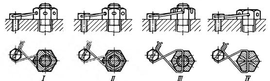 Во многих случаях применяют стопорение гаек при помощи проволоки. Проволоку пропускают через отверстие в гранях стопоримой гайки и через отверстие в смежной гайке или в каком-нибудь близлежащем элементе детали, или в специально устанавливаемом элементе (винт, штифт и т. д.). Концы проволоки скручивают плоскогубцами (рис. 351). Операцию сверления отверстий в гайках выполняют в специальных приспособлениях. Обычно сверлят три отверстия (рис. 351,7), реже шесть (рис. 351,77). При таком способе сто- порения увеличение числа отверстий не имеет смысла, так как правильная вязка может быть осуществлена при большом угле поворота гайки; в отличие от большинства других позитивных способов стопорения вязка позволяет осуществить практически бесступенчатую угловую фиксацию гайки. При вязке надо соблюдать следующее правило: натяжение, возникающее при скручивании концов проволоки, должно создавать момент, способствующий завертыванию стопоримой гайки (рис. 353, Ш). При противоположном направлении вязки (рис. 353,/) проволока не предотвращает самоотвертывание гайки; напротив, появляется момент, способств ующий самоотвертыванию.