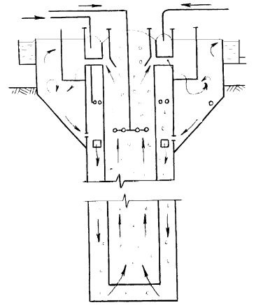Шахтный аэротенк с эрлифтной циркуляцией представляет собой цилиндрический вертикальный резервуар D = 0,6...3 м и высотой 20...50 м (до 100 м). Он может быть заглублен или установлен на поверхности земли.