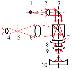 Автоколлимационный метод. При этом используется автоколлимационная трубка Забелина А.А., что позволяет повысить точность в два раза по сравнению с коллимац. методом. Обозначения на рис.4.10: 1-3-осветитель,4-6-микроскоп со шкалой,8-9-дополнительные объективы, Рис. 4.10 10- контролируемое зеркало. Сетка кубика проектируется в центре кривизны линзы10. Смещая 9 или всю трубку совмещают изображение в предметной плоскости. Вращая линзу 10, определяют по сетке микроскопа диаметр (d) круга, который образуется при вращении изображения центра перекрестия коллиматора.