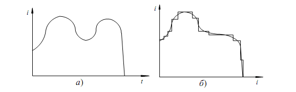 Рис. 2.1. Графики нагрузки: а – непрерывный; б – дискретный Для решения практических задач электроснабжения непрерывный график заменяют дискретным (рис. 2.1, б). Он может быть получен при помощи счетчиков электрической нагрузки. Различают индивидуальные и групповые графики электрической нагрузки – соответственно, для отдельных электроприемников и для группы электроприемников. Зная индивидуальные графики нагрузки, можно получить групповой: