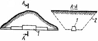 Рис. 6.11. Схема расположения подготовительных выработок при методе штольневых зарядов: 1 – штольня; 2 – контур будущей выемки