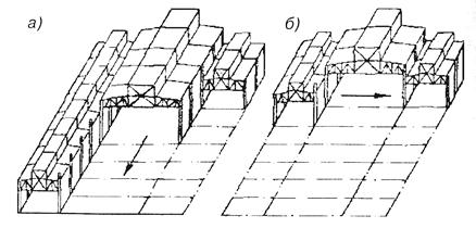 Рис. 9.15. Схемы монтажа одноэтажных промышленных зданий: а — продольный; б — поперечный; (стрелкой показано направление сборки) Элементы конструкций одноэтажных каркасных зданий обладают достаточно большой массой. Так, например, трехступенчатый подколонник может иметь массу 12…15 т, колонны в зависимости от высоты — 8…10 т. Это обстоятельство предопределяет выбор монтажного крана. Как правило, это краны на гусеничном ходу с большим вылетом стрелы и грузоподъемностью 25, 60 и более тонн. Гусеничные краны работают без выносных опор (в отличие от автомобильных и пневмоколесных) и при установке конструкций могут передвигаться с грузом на крюке. Схемы монтажа одноэтажных промышленных зданий показаны на рис. 9.15. Монтаж фундаментов под колонны. Под железобетонные колонны обычно применяют фундаменты стаканного типа. Подготовка оснований под фундаменты производится после разбивочных работ. Фундамент устанавливают на уложенный слой песчаной или цементной подготовки. Наводку фундамента на проектные оси производят в подвешенном к крюку крана состоянии. Границы основания фиксируют предварительно бивочными кольями. После монтажа фундаментов с помощью теодолита проверяют правильность положения фундаментов в плане относителыю разбивочных осей, а нивелиром — отметку дна стакана фундаментов. Смещение осей стаканов фундаментов не должно превышать ±10 мм, а отклонение отметок дна стаканов от проектной — 20 мм. Монтаж железобетонных колонн. Монтаж железобетонных колонн одноэтажных зданий осуществляют при помощи кранов способом «на весу» с предварительной раскладкой их у места установки или с подачей к месту установки на транспортных средствах. Строповка колонн осуществляется одним из следующих способов: обвязкой универсальным стропом или траверсным стропом. Колонны подготавливают к монтажу путем нанесения по четырем граням вверху и на уровне верха фундаментов осевых рисок, а на колоннах, предназначенных для укладки по ним подкрановых балок, кроме того, с двух сторон консолей или траверс двухветвевых колонн наносят риски осей этих балок. При подготовке колонны к монтажу к закладным деталям приваривают опорные столики и крепежные уголки для опирания и закрепления элементов стенового ограждения и других деталей, которые не были закреплены на заводах. На колонны высотой более 12 м, кроме того, закрепляют хомуты или струбцины с двумя расчалками, которыми колонны будут временно расчалены за соседние фундаменты или специальные якоря в плоскости ряда колонн. Колонны в стаканах фундаментов временно закрепляют деревянными, металлическими или железобетонными клиньями, забиваемыми в зазоры между стенкой стакана и колонной. Железобетонные клинья после выверки не удаляют, а оставляют в бетоне омоналичивания. Временное закрепление колонн и их установка в проектное положение может осуществляться инвентарными приспособлениями — металлическими кондукторами. Допускается отклонение осей колонн от вертикали в верхнем сечении (при высоте колонн до 15 м) до ±15 мм. Монтаж железобетонных подкрановых балок. Унифицированные железобетонные подкрановые балки изготавливают таврового сечения пролетом 6 и 12 м. Опирают балки на консоли колонн прямоугольного сечения или траверсы двухветвевых колонн. В этих частях колонн имеются закладные стальны