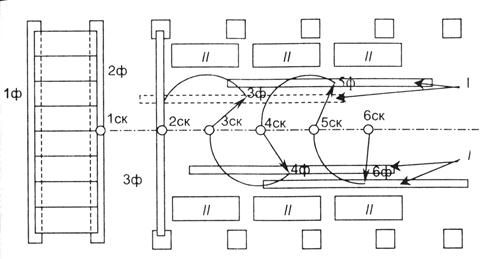 Рис. 9.16. Раскладка ферм и приспособлений для монтажа ферм: 1, 2, 3, 4, 5, 6 — порядковые номера ферм и стоянок крана при их монтаже; I - разложенные фермы; II — штабеля с плитами покрытия