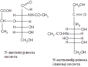Важливими продуктами окиснення похідних моносахаридів в організмі є сіалові кислоти: мурамова і нейрамінова, які містять дев’ять атомів карбону: