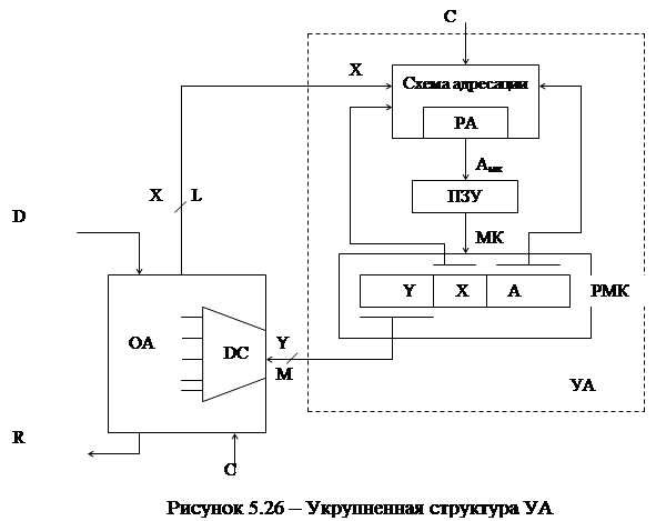 В общем случае (без деталей) УА с ПЛ строится (состоит) из трех составляющих: схемы формирования адреса следующей МК, ПЗУ и блока формирования управляющих сигналов для ОА (рисунок 5.26)