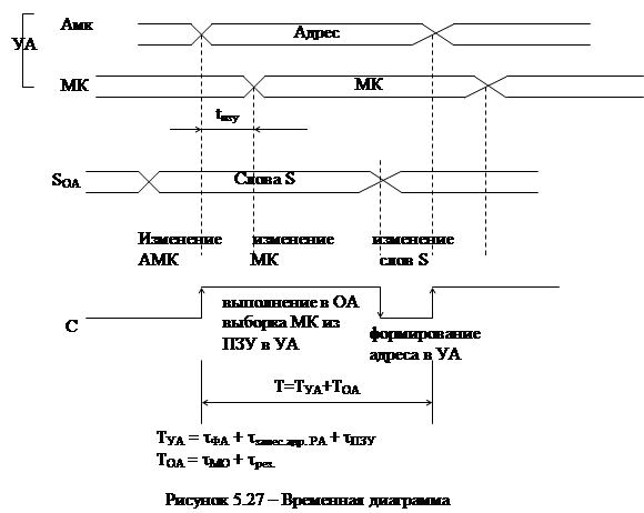 ОА также выполняется в виде отдельных БИС – БИС МПЭ (микропроцессорных элементов). Все эти БИС и входят в состав МПК БИС. Что касается третьего блока, то здесь возможны разные варианты реализации - в зависимости от способа организации работы ОУ во времени. В простейшем случае используется последовательная организация работы ОА и УА (временная диаграмма – рисунок 5.27). Как видно из временной диаграммы, адрес МК не должен меняться в течение такта работы ОУ. Следовательно, он должен фиксироваться в буферном регистре адреса РА по фронту сигнала синхронизации С. Буферный РА в этом случае входит в состав блока (схемы) адресации. Продолжительность такта при последовательной организации определяется: T = TУA + TOA. (5.12)