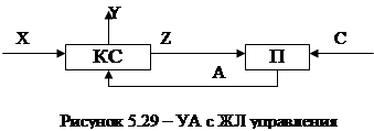 Чтобы построить УА с ЖЛ, необходимо задать функцию переходов δ и функцию выходов λ автомата. Определение функций λ, δ легко производится по ГСА операций fg ОУ. Техническая реализация функций автомата Мили приводит к структуре УА с ЖЛ (рисунок 5.29). Выходной алфавит Y интерпретируется как совокупность выходов УА, с помощью которых управляющие сигналы y1 … yM подаются в ОА. Входной автомат Х интерпретируется как совокупность осведомительных сигналов x1 … xL, поступающих на вход комбинационной схемы КС в качестве аргументов булевских функций y1, …, yM, аргументами которых является еще и информация о состоянии автомата в момент времени t: A(t). Для отображения состояния автомата используется память П, реализуемая на триггерах, количество которых n = log2N зависит от множества состояний. Переход из одного состояния ai в другое aj осуществляется под воздействием сигналов Z, которые формируются на выходах КС, реализующих булевы функции в соответствии с функцией переходов d автомата. Сигналы синхронизации С имитируют автоматное время t. Следует отметить, что переход от функции ОА, которая задается набором ГСА1 … ГСАG к структуре УА с ЖЛ, т. е. конкретной конфигурации комбинационных схем, реализующих функции Y и Z, формализован и, следовательно, может быть автоматизирован. Это позволяет получать схемы УА автоматически: на входе системы набор ГСА, а на выходе – документация, схема УА (фактически это САПР УА с ЖЛ). [С. И. Баранов. Синтез микропрограммных автоматов. - Л: Энергия, 1979]. Характеристики УА с ЖЛ – быстродействие и затраты оборудования. Быстродействие УА с ЖЛ характеризуется временем формирования управляющих сигналов ym: ty = tТР + 2tАЭ = 5tАЭ, где tТР - время переключения триггеров памяти, tЛЭ - задержка одного логического элемента в КС УА.