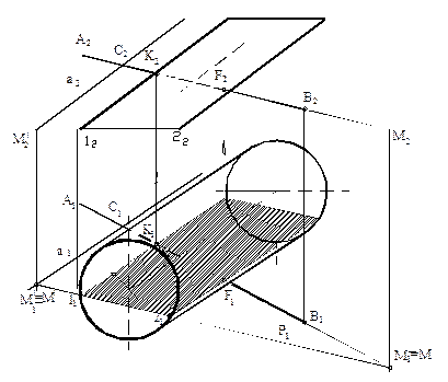 Решение: Через заданную прямую АВ проведена вспомогательная плоскость Р, параллельная образующим цилиндра. Плоскость Р задана двумя пересекающимися прямыми АВ и а. Прямая а проведена параллельно образующим поверхности цилиндра. Построена фигура сечения цилиндра с плоскостью Р. Для этого, найден горизонтальный след плоскости Р – Р1. На пересечении следа Р1 с основанием цилиндра определены проекции точки 11 и 21. Через эти точки и пройдут горизонтальные проекции образующих, по которым вспомогательная плоскость Р рассекает поверхность цилиндра. В пересечении образующих, проходящих через проекции точек 11 и 21, с проекцией А1В1 получены проекции точек K1 и F1 – горизонтальные проекции точек пересечения прямой АВ с поверхностью наклонного цилиндра. Фронтальные проекции K2 и F2 определятся по принадлежности этих точек заданной прямой АВ. Определена видимость прямой, относительно поверхности, цилиндра методом конкурирующих точек.