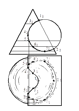 Фронтальная проекция линии пересечения (проекции точек 12,22,32,42,52,62,72) определяется по принадлежности точек поверхности цилиндра. Горизонтальная проекция линии пересечения определяется из условия принадлежности ее поверхности конуса. Для построения горизонтальных проекций точек (11,22,31,41,51,61,71), на поверхности конуса проведены параллели через проекции точек, 32,42,52, 62, 72, а проекции точек 11 и 21 определены по принадлежности очерковой образующей конуса.