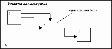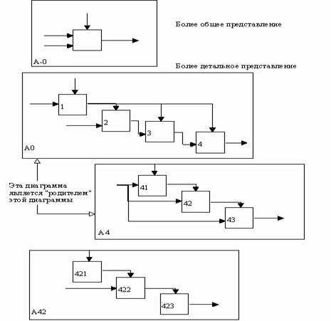 Рис. 16. Декомпозиция диаграмм [1] На рис. 17 представлены различные варианты выполнения функций соединения дуг с блоками. Некоторые дуги присоединены к блокам диаграммы обоими концами, у других же один конец остается неприсоединенным. Неприсоединенные дуги соответствуют входам, управлениям и выходам родительского блока. Источник или получатель этих пограничных дуг может быть обнаружен только на родительской диаграмме. Неприсоединенные концы должны соответствовать дугам на исходной диаграмме. Все граничные дуги должны продолжаться на родительской диаграмме, чтобы она была полной и непротиворечивой. На SADT-диаграммах не указаны явно ни последовательность, ни время. Обратные связи, итерации, продолжающиеся процессы и перекрывающиеся (по времени) функции могут быть изображены с помощью дуг.