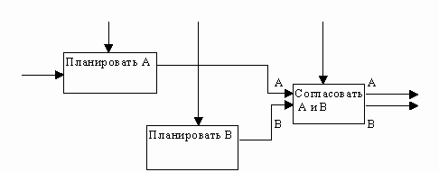 Рис. 22. Процедурная связность [1] (4) Тип коммуникационной связности. Диаграммы демонстрируют коммуникационные связи, когда блоки группируются вследствие того, что они используют одни и те же входные данные и/или производят одни и те же выходные данные (рис. 23). (5) Тип последовательной связности. На диаграммах, имеющих последовательные связи, выход одной функции служит входными данными для следующей функции. Связь между элементами на диаграмме является более тесной, чем на рассмотренных выше уровнях связок, поскольку моделируются причинно-следственные зависимости (рис. 24).