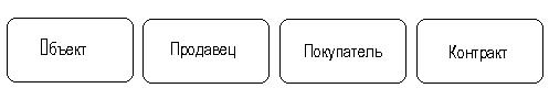 Сущность (Entity) - реальный либо воображаемый объект, имеющий существенное значение для рассматриваемой предметной области, информация о котором подлежит хранению (рис. 31). Рис. 31. Графическое изображение сущности [1] Каждая сущность обладает уникальным идентификатором. Каждый экземпляр сущности должен однозначно идентифицироваться и отличаться от всех других экземпляров данного типа сущности. Каждая сущность должна обладать некоторыми свойствами: · каждая сущность должна иметь уникальное имя, и к одному и тому же имени должна всегда применяться одна и та же интерпретация. Одна и та же интерпретация не может применяться к различным именам, если только они не являются псевдонимами; · сущность обладает одним или несколькими атрибутами, которые либо принадлежат сущности, либо наследуются через связь; · сущность обладает одним или несколькими атрибутами, которые однозначно идентифицируют каждый экземпляр сущности; · каждая сущность может обладать любым количеством связей с другими сущностями модели. Обращаясь к приведенным выше выдержкам, видно, что сущности, которые могут быть идентифицированы с главным менеджером - это объекты и продавцы. Продавцу важны объекты и связанные с их продажей данные. Для администратора важны покупатели, объекты, продавцы и контракты. Исходя из этого, выделяются 4 сущности (объект, продавец, покупатель, контракт), которые изображаются на диаграмме следующим образом (рис. 32).