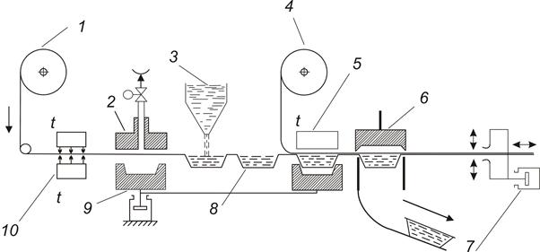 Рис. 3.4. Схема компонування автомата для фасування сметани: 1 — рулон термопластика; 2 — пуансон; 3 — дозатор; 4 — рулон кашированої фольги; 5 — зварювання кришки; 6 — штамп для випікання коробочки; 7 — синхронізатор швидкості для центрування малюнка; 8 — заспокоєння (вирівнювання); 9 — матриця; 10 — підігрівники