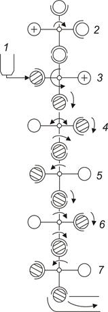 Рис. 3.9. Схема розімкненої роторної лінії: 1 — дозатор; 2 — подавання банок (роторний транспортер); 3 — наповнення; 4 — подавання кришок і підкатка; 5 — перевантаження (роторний транспортер); 6 — кінцева закатка; 7 — роторний завантажувач