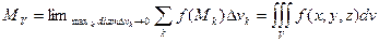 Так задача о массе пространственной области приводит к тройному интегралу. Введем некоторые ограничения на область интегрирования и подинтегральную функцию, достаточные для существования интеграла. Потребуем, чтобы функция f(M) была непрерывна в области V и на ее границе. Потребуем, чтобы область V была замкнутой, ограниченной, пространственно-односвязной областью с кусочно-гладкой границей. Область назовем пространственно-односвязной, если ее можно непрерывной деформацией стянуть в точку. Теорема существования. Пусть область V и функция f(M)=f(x, y, z) удовлетворяют сформулированным требованиям. Тогда тройной интеграл существует как предел интегральных сумм.