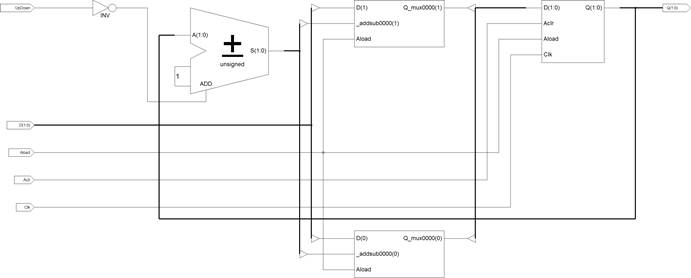architecture EXAMPLE of ASYNC_COUNT2 is signal COUNTER: UNSIGNED (1 downto 0); process (CLK, PRESET, UPDOWN, DJN, CLEAR, COUNTER) if PRESET = '1' then COUNTER <= UNSIGNED (DIN); elsif CLEAR = '1' then COUNTER <= (others => '0'); elsif CLK = '1' and CLK'EVENT then if LJPDOWN ='1' then COUNTER <= COUNTER + 1; COUNTER <= COUNTER - 1; end if; end if; DOUT <= STD_LOGIC_VECTOR(COUNTER); end process; end;