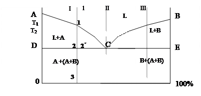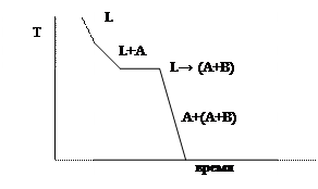 АСВ – ликвидус. DСЕ – солидус. При охлаждении по АС начинают выделяться кристаллы А, по СВ – кристаллы В. На линии DСЕ из жидкости концентрации С одновременно выделяются кристаллы А и В, образуя эвтектику. DСЕ – линия эвтектических превращений. Ниже линии АС область двухфазная. Здесь существуют одновременно жидкий раствор L и твердая фаза – кристаллы А. Рассмотрим кривую охлаждения для сплава I. В точке 1 – начало кристаллизации сплава. На кривой охлаждения наблюдается перегиб. В процессе кристаллизации состав жидкости будет меняться по линии АС. В т.2 жидкость будет иметь концентрацию точки С. При этой температуре из жидкости одновременно выделяются кристаллы А и В, образуя механическую смесь – эвтектику (А+В), т.е. образуются двухфазные кристаллы. Этот процесс изотермический и происходит по линии DСЕ, кот. называется линией эвтектических превращений. С – тройная точка: при данной температуре и данном составе в системе существует 3 фазы: L, А, В. Кривая охлаждения для сплава I: