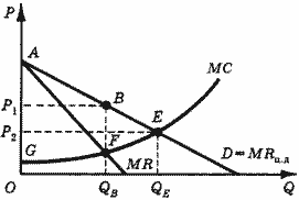 Монополисту становится выгодно увеличивать объем производства и продаж (за счет снижения цены на каждую последующую единицу товара) до тех пор, пока цена не опустится до величины P2, равной предельным затратам. Общий объем производства возрастает с QB до QE. Это столько же, сколько производилось бы в условиях совершенной конкуренции. Однако монополист перераспределяет в свою пользу весь излишек потребителя. Общая величина излишка становится равной площади фигуры, ограниченной осью ординат и кривыми МС и D (GAEF). В случае совершенной конкуренции при единой цене товарного рынка Р2 покупатели сохранили бы излишек, равный площади треугольника Р2AE.