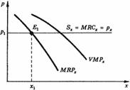 Кривая VMРx MRРx на рис. 2 имеет отрицательный наклон, потому что c увеличением применения переменного ресурса MРx уменьшаетcя, а цена продукта P остается прежней (фирма - со вершенный конкурент на рынке продукта). Для фирмы цена ресурса задана из вне и постоянна, т. е. кривая предложения ресурса Sx является горизонтальной линией: объем спроса фирмы на ресурс X настолько мал по сравнению с рыночным объемом спроса, что фирма не может по влиять на цену ресурса (фирма - совершенный конкурент на рынке ресурса).