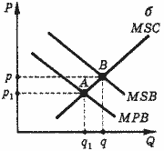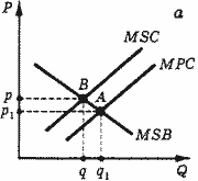 Как видно из рис. 1, рыночное равновесие установится в точке А, и объем выпуска q1 не является парето-эффективным. Поскольку фирмы несут только часть реальных затрат, в точке А имеет место перепроизводство блага. Если бы все затраты были включены в цену, парето-эффективное равновесие установилось бы в точке В.