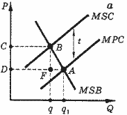 Без корректирующего налога рыночное равновесие было в точке А. Введение налога привело (в условиях совершенной конкуренции) к росту цены и подняло МРС до уровня MSC. Это привело к уменьшению выпуска продукции. Величина налогового сбора равна площади прямоугольника CBFD. Новое равновесие, достигнутое в точке В, является эффективным, так как выполняется условие: