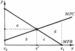 В этом случае "Красный квадрат" выбирет величину загрязнения на уровне x1, при котором его предельная выгода равна нулю (MPB = 0). Уровень загрязнения будет неэффективно велик, потому что его воздействие на пивоваренный завод химическим предприятием игнорируется. В этом случае пивоваренному заводу будет выгодно предложить "Красному квадрату" сократить уровень загрязнений до x*, компенсировав ему потерю прибыли в размере фигуры с. "Емельян Пугачев" при этом сэкономит свои затраты на сумму c + d, получив чистый выигрыш в размере d. В результате возникнет парето-эффективное распределение ресурсов и общая прибыль достигнет максимума.