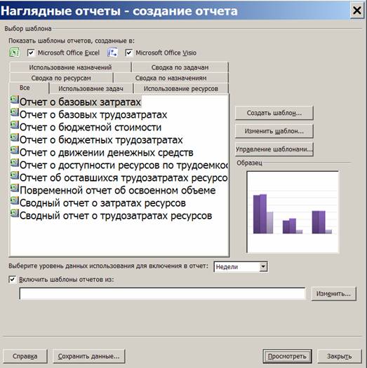 Наглядные отчеты используются для отображения сводных данных по проекту средствами Microsoft Office Excel или Microsoft Office Visio. Окно создания такого отчета открывается пунктом меню Отчет/Наглядные отчеты и изображено на рис. 9.11.