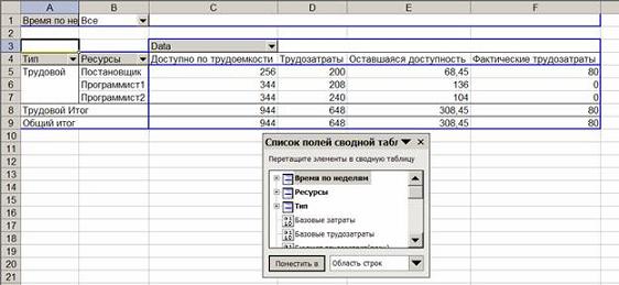 Перечисленные наглядные отчеты формируются в Microsoft Office Excel в виде книги, содержащей два рабочих листа. Первый лист содержит сводную диаграмму, а второй – сводную таблицу. При помощи их полей выбора можно выполнить детализацию и фильтрацию данных. Пример сводной диаграммы для отчета Сводный отчет о трудозатратах ресурсов приведен на рис. 9.12. Сводная таблица для этого же отчета изображена на рис. 9.13. Помимо предопределенных можно создать свой собственный отчет, воспользовавшись кнопкой Создать отчет окна рис. 9.11. В процессе создания требуется: 1. выбрать систему (Excel или Visio); 2. выбрать куб данных, на основании которого строится отчет: Использование назначений, Использование задач, Использование ресурсов, Сводка по ресурсам, Сводка по задачам, Сводка по назначениям; 3. выбрать поля куба, которые включаются в отчет; 4. создать макет перекрестной таблицы в Excel, перетащив из списка названия полей в области заголовков строк, заголовков столбцов и область данных.