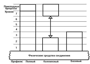 Рис. 17.7. Классификация сетевых функциональных профилей По числу используемых уровней области взаимодействия выделяют полные функциональные профили, коллапсные функциональные профили и базовые функциональные профили (рис.17.8).