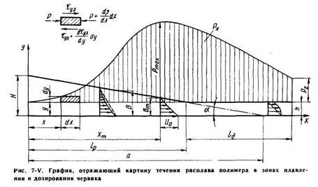 Основные параметры технологического процесса переработки термопластов па червячных прессах подразделяются на две категории: определяющие (устанавливаемые непосредственно оператором) и производные. К определяющим параметрам относятся: температура в зонах корпуса червяка, частота вращения червяка и питающего органа бункера, температура хладагента на сливе из канала червяка. Производными параметрами являются: производительность червячного пресса по расплаву полимера, давление расплава на входе в формующую головку, осевое усилие на червяке, мощность, потребляемая червячным прессом от электродвигателя и от нагревателей цилиндра. Определяющие и производные параметры связаны прямой зависимостью. Количественное соотношение этих параметров изменяется при изменении геометрии червяка, вида перерабатываемого термопласта и конструкции каналов формующей головки (точнее — ее гидравлического сопротивления). Основная характеристика процесса экструзии — производительность, которая является функцией многих переменных и в зависимости от конструкции и типоразмера экструдера изменяется для современных машин от 3 до 20000 кг/ч. При этом осевое усилие на червяке может меняться от нескольких сотен килограммов до 600 тс. Температурный режим обогрева цилиндра пресса определяется видом перерабатываемого полимера и экст-рудируемого изделия. Эти режимы изменяются от 120—150° С для мягкого поливинилхлорида и полиэтилена низкой плотности до 500—550° С для фторопластов. В настоящее время отсутствуют единые инженерные методики проектного расчета технологических параметров процесса и геометрических параметров рабочих органов одно- и двухчервячных прессов. Это объясняется сложностью и комплексным характером динамики процессов экструзии, трудно поддающихся математическому описанию. Так, аналитическое выражение процесса транспортирования, сжатия, смешения, плавления и выдавливания термопласта экструде-ром должно учитывать одновременное и взаимосвязанное действие факторов, основанное на законах теплофизики, гидродинамики неньютоновских жидкостей, механики полимеров и термодинамики. Развитие инженерных методов расчета параметров процесса и размеров оборудования на современном этапе происходит по двум направлениям. Одно из них—разработка системы уравнений, обеспечивающих поверочный расчет основных параметров процесса: производительности, создаваемых червяком давлений, осевых усилий на червяк и потребляемой мощности при заданной геометрии рабочих органов пресса. При этом используют метод последовательных приближений для решения задачи выбора оптимальных параметров червяка и формующей головки; для обеспечения необходимой степени точности решения задачи это требует в ряде случаев использования электронно-вычислительных машин. Червячные прессы можно рассчитывать также моделированием нового процесса и оборудования на основе известных параметров пресса-модели. Этот метод более прост и менее громоздок по сравнению с первым, хотя уступает ему по точности результатов. В соответствии с тенденциями развития одночервячных прессов намечается значительное увеличение частоты вращения и удлинение червяков до LID = 30-35, а следовательно, и существенное повышение производительности. В этой связи возникает необходимость более п