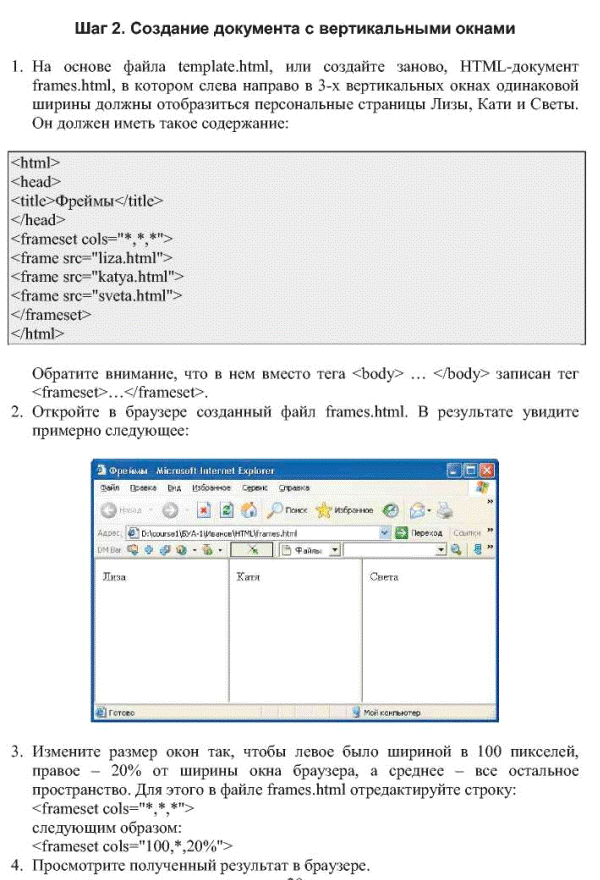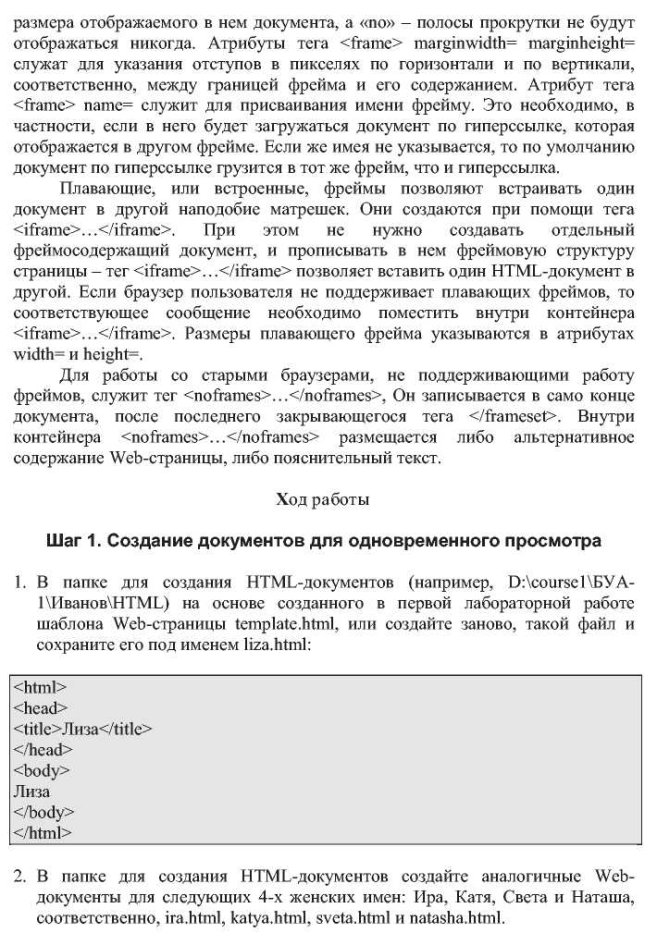 Индивидуальные задания 1. В папке для хранения результатов выполнения индивидуальных заданий по лабораторным работам MYHTML создайте личный мини Web-сайт, на котором будете отображать информацию о себе, родителях, друзьях, любимых предметах, увлечениях и т.д. Главная страница должна содержать минимум 3 фрейма: логотип, меню и содержание. 2. В отчет включите распечатку web-страницы и текст на языке HTML.