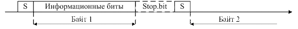 Стартовый сигнал изменяет состояние линии интерфейса и служит для запуска генератора приемнике, стоповой сигнал переводит линию в исходное состояние и останавливает работу генератора. Таким образом, синхронизация передатчика и приемника поддерживается только в интервале одного байта.