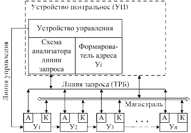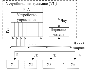 Если инициатива обмена исходит от периферийного устройства Уi, то оно передает сигнал по своей линии запроса, который поступает в i-й разряд регистра запроса РгЗ. Как только Уц освобождается от предыдущего обмена, его устройство управления (УУ) интерфейсом последовательно опрашивает разряды регистра РгЗ и посредством переключателя К соединяет линии Лц с соответствующими линями Лi устройства Уi. Порядок опроса разрядов РгЗ определяет приоритет обслуживания устройств Уi.