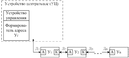 Если обмен инициируется устройством Уц, адрес запрашиваемого устройства (Уi) передается на линии Л1 и попадает в устройство У1. Запрашиваемый адрес в устройстве У1 сравнивается с собственным адресом У1. Если адреса не совпали, то коммутатор К соединяет линии Л1 с линиями Л2. Таким образом адрес запрашиваемого устройства попадает в У2 и процедура повторяется. Если значения адресов совпали, то коммутатор К остается в разомкнутом состоянии, а устройство, опознавшее свой адрес, логически подключается к Уц. При цепочной схеме подключения устройств процедура адресации выполняется последовательно. Пусть обмен инициируется одним из устройств У1,...,Уn, например, У2. При этом устройство отключает посредством коммутатора К все устройства более низкого приоритета (У3,...,Уn), т.е.размыкает линии Л3. Затем устройство У2 передает свой адрес по линии Л2. Этот адрес либо передается устройством У1 на линии Л1, если У1 не ведет обмена, для чего коммутатор К в У1 подключает линии Л2 к линиям Л1, либо блокируется, если устройство У1т ведет обмен с Уц. Процедура опроса не требует последовательного перебора адресов У1,...,Уn, что значительно ее ускоряет.