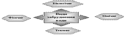 Фізичне забруднення — збільшення нерозчинних часток (глина, пісок, мул), внаслідок чого зменшується прозорість води, погіршуються умови росту та розвитку водоростей, риб та інших водних організмів. Хімічне забруднення — забруднення води сполуками неорганічного та органічного походження (особливої шкоди завдають нафтопродукти, пестициди, токсичні речовини, поверхнево-активні речовини). Посилення шкідливої дії відбувається за рахунок кумулятивного ефекту. Біологічне забруднення — забруднення стоками, що містять велику кількість мікроорганізмів, особливо небезпечним є забруднення хвороботворними мікроорганізмами. Теплове забруднення — скидання у водойми теплих вод після охолодження виробничих процесів. Вода з температурою вище 26ºС пригнічує розвиток більшості водних організмів. Антропогенне теплове забруднення біосфери в загальному масштабі незначне і не завдає відчутної шкоди природі. У деяких випадках теплову енергію використовують для обігріву ставків, що сприяє збільшенню обсягів вирощування риби.
