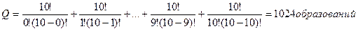 Пример 1. 1) В случае сочетаний из 10 элементов по 0,1,2,3,4,5,6,7,8, и 9 элементам получается следующее число образованний