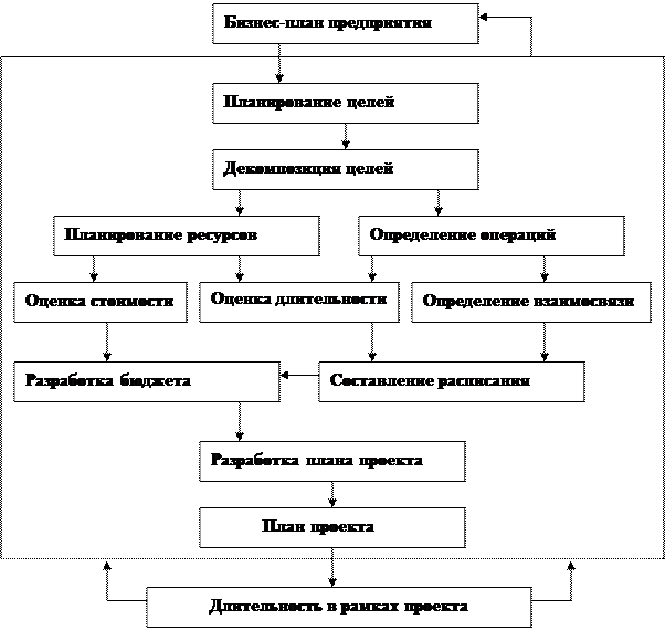 Современные методы управления проектами уходят корнями в 50-е годы ХХ в. Практически одновременно две проектные группы представили методы управления сложными комплексами работ. Компании Du Pont и Remington Rand предложили «метод критического пути» (Critical Path Method, CРМ), который получил наибольшее распространение. Суть метода заключается в том, что, зная логику выполнения и длительность работ, рассчитывают наиболее раннюю дату завершения проекта и определяют критический путь, т. е. выявляют работы, которые имеют нулевой резерв времени. Современные представления о методах управления проектами собраны в своде знаний об управлении проектами (Project Management Body of Knowledge, PMBOK). Структура и содержание РМВОК в разных странах может отличаться, так как многие национальные ассоциации управления проектами имеют неодинаковые точки зрения на содержание этого документа. Опираясь на общепринятый метод организации процесса планирования, его можно представить в виде этапов, взаимосвязь которых показана на рис. 5.6. Все этапы планирования являются многоитеративными процессами и повторяются несколько раз, до тех пор, пока не будет получен необходимый результат. Этапы планирования имеют следующее содержание. Планирование целей (Scope Planning) - разработка документа, в котором определены цели проекта. Отправной точкой служат описание продукта. Обоснование проекта, общие ограничения, информация об уже выполненных аналогичных проектах.