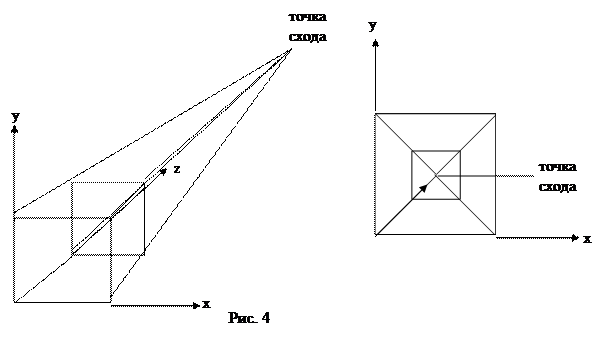 Центральные проекции классифицируются в зависимости от числа главных точек схода, которыми обладают, а следовательно и от числа координатных осей, которые пересекает проекционная плоскость. На рис. 4 приведены две различные одноточечные проекции куба. Ясно, что это – одноточечные проекции, поскольку прямые параллельные осям x и y, не сходятся, а сходятся только линии, параллельные оси z