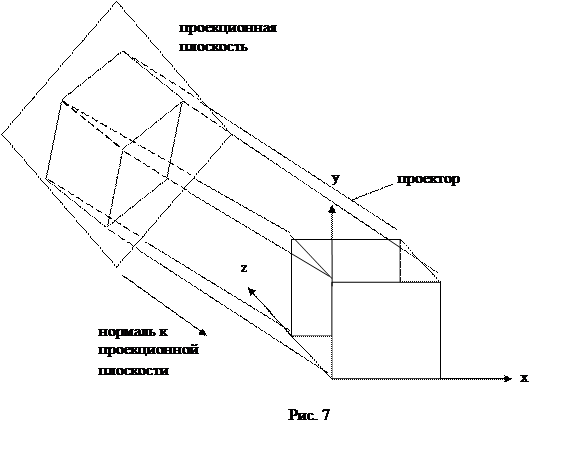 На рис. 5 показан процесс построения одноточечной, центральной проекции, некоторые из ее проекторов, а также проекционная плоскость, пересекающая одну лишь ось z. Параллельные проекции. Параллельные проекции разделяются на два типа в зависимости от соотношения между направлением проецирования и нормалью к проекционной плоскости. В ортографических параллельных проекциях эти направления совпадают, а в косоугольных параллельных проекциях они не совпадают. То есть в ортографических проекциях направление проецирования является нормалью к проекционной плоскости.