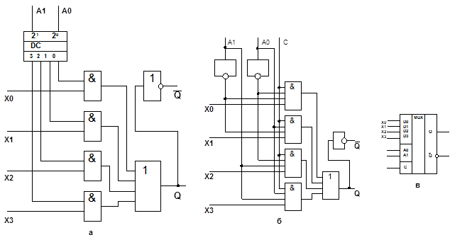 Простейший мультиплексор, реализующий заданное табл. 5.6 преобразование, можно построить на логических элементах И, ИЛИ и линейном дешифраторе (рис. 5.7, а). В такой структуре выход мультиплексора X устанавливается с задержкой адресных сигналов в трех логических ступенях Быстродействие мультиплексора можно увеличить, если совместить дешифратор адреса и информационные вентили (рис. 5.7,6). Вход С (рис. 5.7, в) обеспечивает передачу информации в канал только в разрешенные строб-импульсом моменты времени.