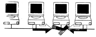 Рис. 3.23. Одновременная передача данных двумя компьютерами приводит к коллизии. Чтобы передавать данные по сети от одного пользователя к другому или получить их с сервера, должно быть несколько способов: § поместить данные в кабель без «столкновения» с уже передаваемыми по нему данными; § принять данные с достаточной степенью уверенности в том, что при передаче они не были повреждены в результате коллизии. Все сетевые компьютеры должны использовать один и тот же метод доступа, иначе произойдет сбой в сети. Отдельные компьютеры чьи методы будут доминировать, не дадут остальным осуществить передачу. Методы доступа служат для предотвращения одновременного доступа к кабелю нескольких компьютеров, упорядочивая передачу и прием данных по сети и гарантируя, что в каждый момент времени только один компьютер может работать на передачу.