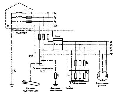 Рисунок 6.3 - Заземление в низковольтной сети: Л1, Л2, Л3 – фазные провода сети; ЗПН – защитный провод нейтрали; ЗП – защитный провод; Н – нейтральный провод; Зз – защитный автомат; RА, RВ – сопротивление заземлителя потребителя и подстанции Понятие «масса» поясняет рисунок 6.4.