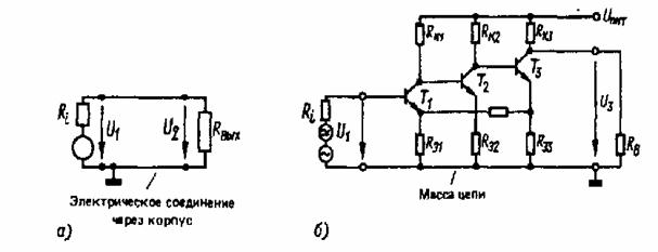 Понятие «земля» поясняет рисунок 6.3. В нормальном режиме по нейтральному проводу Н протекает обратный ток электроприемников и его потенциал вследствие падения напряжения на его сопротивлении отличается от потенциала земли (за исключением эквипотенциальной шины, где он равен потенциалу земли). Защитный провод ЗП в нормальном режиме тока не проводит и его потенциал равен потенциалу земли. Поскольку корпус оборудования присоединен к защитному проводу ЗП, то и его потенциал также равен потенциалу земли и не создает угрозы для людей и животных. При замыкании одного из фазных проводов (на рисунке 6.3 провода Л3) на корпус оборудования в фазном проводе возникает большой ток короткого замыкания и оборудование отключается предвключенным защитным автоматом Зз. Под массой в схемотехнике понимают общую систему опорного потенциала, по отношению к которой измеряются узловые напряжения цепи (шина, провод опорного потенциала, корпус, нулевая точка). В простой цепи это просто обратный провод, в электронной схеме - общий обратный провод для всех электрических контуров (рисунок 6.4,а,б).Масса может, но не должна иметь потенциал земли. Однако, как правило, она в одном месте непременно соединена с защитным проводом и тем самым заземлена. Масса выполняет те же функции, что и нейтральный провод. Прежде всего, на работу схемы не оказывает влияния заземление массы. Однако если занимающая достаточно обширное пространство масса заземлена в нескольких местах, возникает контур заземления (см. рисунок 6.2). Тогда при различных потенциалах точек заземления могут протекать уравнительные токи, а на полных сопротивлениях массы возникать падения напряжения, которые накладываются на напряжения, действующие вдоль отдельных контуров цепи и являются противофазными помехами. При высоких частотах это даже не требует гальванического заземления, так как при наличии печатных плат с навесным монтажом и плоской массой контуры заземления могут образовываться благодаря их емкостям относительно массы.