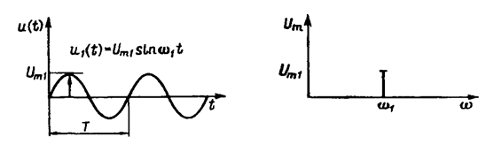 Синусоидальные или косинусоидальные помехи (гармонические процессы) могут быть представлены как во временной, так и в частотной областях непосредственно (рисунок 6.6). В частотной области помеха характеризуется угловой частотой ω и частотой колебаний