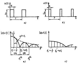 При анализе ЭМС вместо двустороннего математического спектра В заключение на рисунке 6.10. показаны импульсы прямоугольной формы двух периодически изменяющихся напряжений одной и той же основной частоты, однако различной скважности, и относящиеся к ним линейчатые спектры. Из вышесказанного можно установить следующее: наименьшая частота Амплитуды высших гармоник появляются с одинаковым интервалом