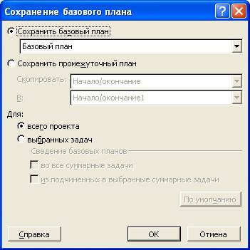 После составления плана проекта начинается выполнение запланированных работ. Главная цель отслеживания проекта – своевременно обнаружить отклонения фактических работ от запланированных. Для этого надо собирать данные о ходе выполнения работ и сравнивать их с базовым планом проекта. Чтобы это было возможно, перед началом выполнения работ надо зафиксировать базовый план, с которым далее пойдет сравнение текущих состояний. Для сохранения базового плана надо выбрать в меню команду Сервис – Отслеживание – Сохранить базовый план. Появится диалоговое окно Сохранение базового плана. При первом сохранении необходимо выбрать сохранение базового плана для всего проекта (рисунок 7.1). Помимо базового плана MS Project позволяет сохранять промежуточные планы.