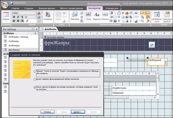 - В режиме Конструктора формы выбрать элемент Поле со списком и перенести на главную форму.