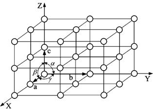 Правильно расположенные атомы образуют пространственную или кристаллическую решетку. Главной отличительной особенностью кристаллических твердых тел является периодическое расположение в пространстве их атомов, образующих пространственную трехмерную кристаллическую решетку. С периодическим расположением атомов связана и естественная огранка кристаллов. Анизотропное расположение атомов в кристаллической решетке объясняет анизотропию многих физических свойств твердых тел, широко используемую в технике. Тепловые свойства кристалла вытекают из анализа колебаний его кристаллической решетки. Рассмотрение движения электронов в периодическом потенциале кристаллической решетки объясняет электрические свойства кристаллов. Атомы в кристаллическом твердом теле располагаются в пространстве закономерно, периодически повторяясь в трех измерениях через строго определенные расстояния, т.е. образуют кристаллическую решетку. Кристаллическую решетку можно «построить», выбрав для этого определенный «строительный блок» (аналогично постройке стены из кирпичей) и многократно смещая этот блок по трем непараллельным направлениям. Такая «строительная» единица кристаллической решетки имеет форму параллелепипеда и называется элементарной ячейкой. Все элементарные ячейки, составляющие кристаллическую решетку, имеют одинаковую форму и объемы. Атомы могут располагаться как в вершинах элементарной ячейки, так и в других ее точках (в узлах кристаллической решетки). В первом случае элементарные ячейки называются простыми (примитивными), во втором — сложными. Если форма элементарной ячейки определена и известно расположение всех атомов внутри нее, то имеется полное геометрическое описание кристалла, т.е. известна его атомно-кристаллическая структура. В кристаллографии рассматривают 14 типов элементарных ячеек. Их называют пространственными решетками Бравэ. Для характеристики элементарной ячейки задают шесть величин: три ребра ячейки а, b, с и три угла между ними α, β, γ (рисунок 9). Эти величины называются параметрами элементарной ячейки (кристаллической решетки). Все 14 решеток Бравэ распределены по семи кристаллическим системам (сингониям) в соответствии с ориентацией и относительными величинами параметров решетки (таблица – 1). Каждая кристаллическая система включает одну или несколько типов пространственных кристаллических решеток. В простой решетке атомы располагаются только по вершинам решетки, в объемно-центрированной еще один атом в центре решетки, в гранецентрированной еще по одному в центре каждой грани, а в базоцентрированной еще по одному атому в центрах пары параллельных граней.