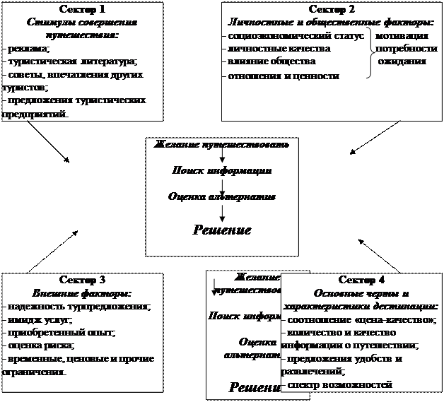 Рис. 1.3. Основная система туризма по Н. Лейперу. Согласно данной модели турист является главным субъектом системы туризма, а туризм – деятельность, которая воспринимается как очень важный аспект жизни многих людей. В данной модели можно выделить три геопространственных элемента: - регион, в котором формируется спрос на туристические услуги (отправляющий регион); - туристическую дестинацию; - транзитный регион. Таким образом, желание посетить дестинацию обусловливает действие туристической системы и образует спрос на туристические услуги в отправляющем регионе. Туристическая дестинация представляет собой самую существенную компоненту туризма. С одной стороны, дестинация - это место, которое является целью путешествия, с другой - процесс достижения цели должен быть управляемым. Именно в дестинации проявляется влияние туризма на путешественника в целом, и реализуются стратегии планирования и управления. Автор при этом не раскрывает объекты и уровни управленческого процесса, однако отмечает, что именно в дестинации ощущаются наиболее значительные и драматические последствия туризма, и обосновывает необходимость управления данным процессом. В модели американского маркетолога Ф. Пирса дестинация рассматривается как место, где путешественники могут получить разнообразные впечатления, опыт и эмоции. Ф.Пирс считает, что диапазон впечатлений, которые люди стремятся получить от отдыха в конкретном месте, положен в основу сегментации рынка. То есть, рассматривается мотивационный механизм путешествий, который является определяющим фактором в процессе прогнозирования туристских потоков и объемов туристского спроса, направленных в конкретное место - дестинацию. Английский ученый Дж. Суорбрук, исследуя особый характер дестинации, утверждает, что она является центральным звеном туристического продукта, имея ввиду наличие в ней природных и культурных объектов туристического интереса, которые побуждают туриста посетить дестинацию. Дестинации занимают центральное место в сложной иерархической структуре взаимозависимых элементов системы туризма: от нужд, пожеланий и мотивации туристов к факторам, которые определяют принятие решений о путешествии. На рисунке 1.4. показана одна из моделей дестинации, описанных Н. Шмоллом. С маркетинговой точки зрения дестинация - это туристический продукт конкретной местности (объекта), предложенный для продажи в форме комплекса материальных и нематериальных ценностей. Ими могут быть: памятники истории, архитектуры, продукция народного творчества, блюда национальной кухни, чистый воздух, природа, окружающие среда, виды размещения, передвижения, питание и пр.
